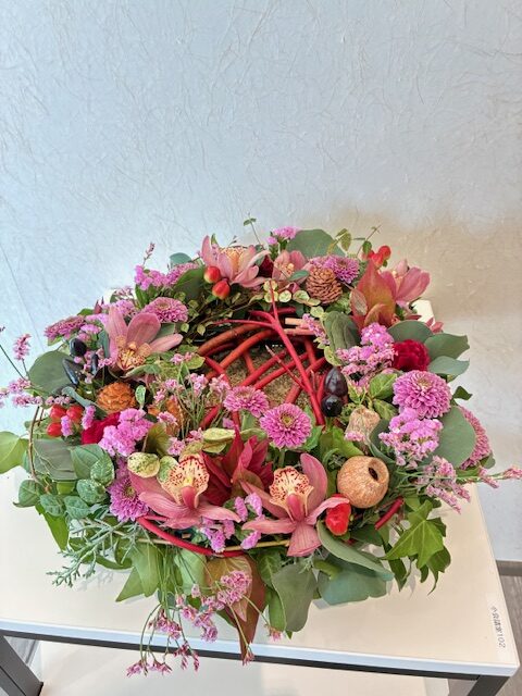 今回は「秋の輝き」をテーマに、リーススタイルのアレンジメントを制作しました。